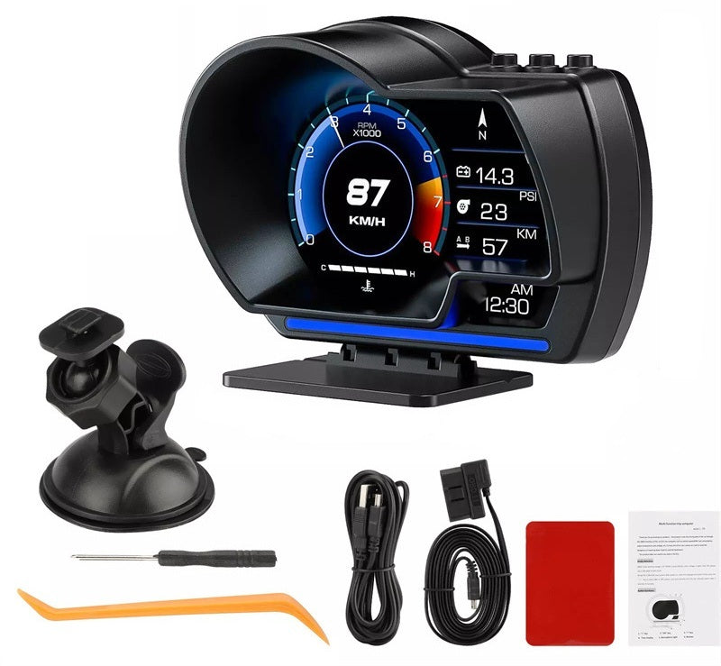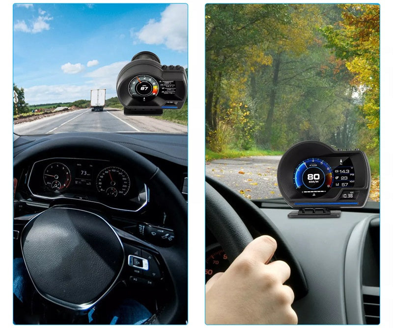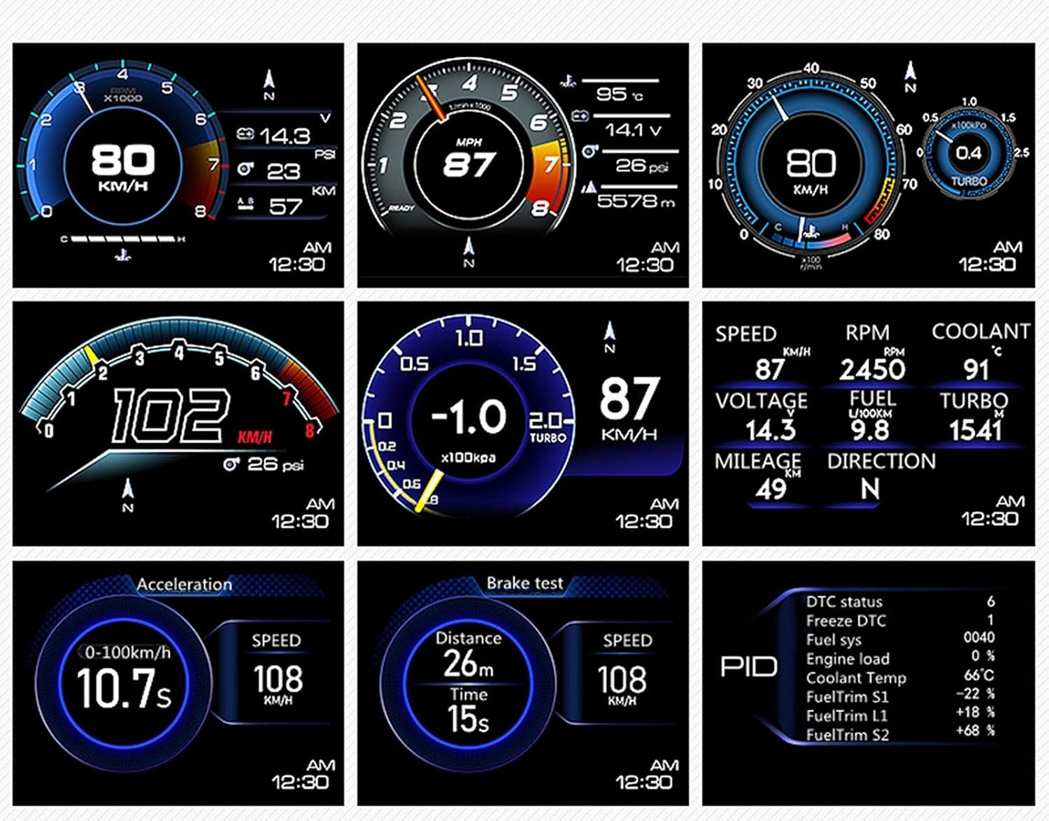 تمتع بقيادة آمنة واحترافية مع عرض فوري للسرعة، وحرارة المحرك، وجهد البطارية، وضغط التيربو عبر نظام OBD2 أو GPS.